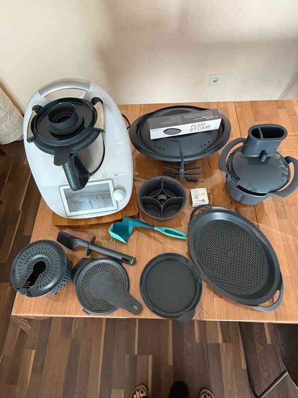 TM7: zcela nový multifunkční kuchyňský robot: nový design, výkonný, tichý motor, 10palcový dotykový displej, 10 000 receptů. Nikdy jsem ho nepoužívala. Byl to dárek od mého bývalého, který si myslel, že bych si měla doma hodně vařit sama.